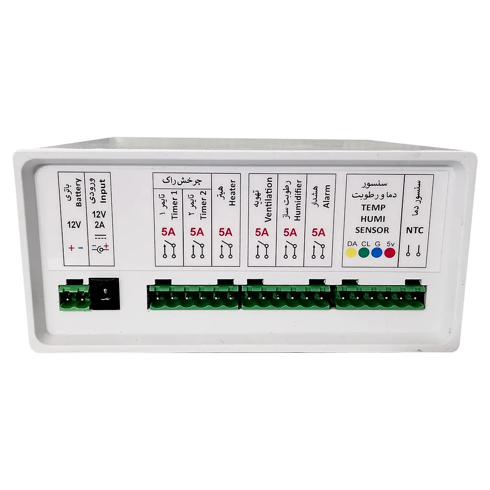 این دستگاه دارای 6 خروجی شامل هیتر، رطوبت ساز، فن تهویه یا دمپر، هشدار و 2 خروجی تایمر برای حرکت راکها میباشد.